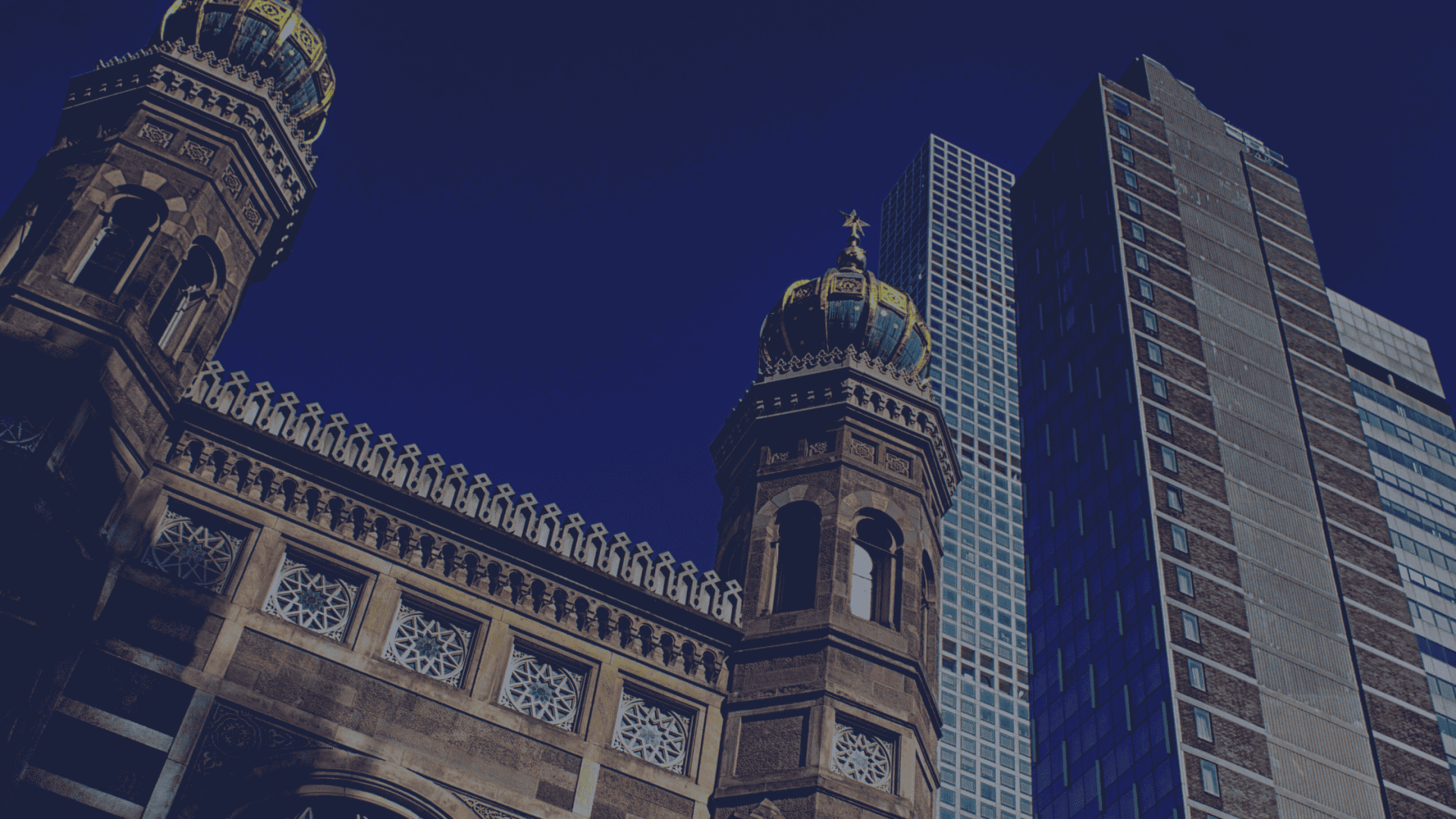 Designed by Henry Fernbach, the exterior of the Central Synagogue is dominated by two octagonal towers rising 122 feet that are meant to be reminiscences of Solomon’s Temple. The towers are topped with onion-shaped, green copper domes and has one large window accompanied by many smaller arched windows. The Central Synagogue is the oldest synagogue in continual usage in New York City.