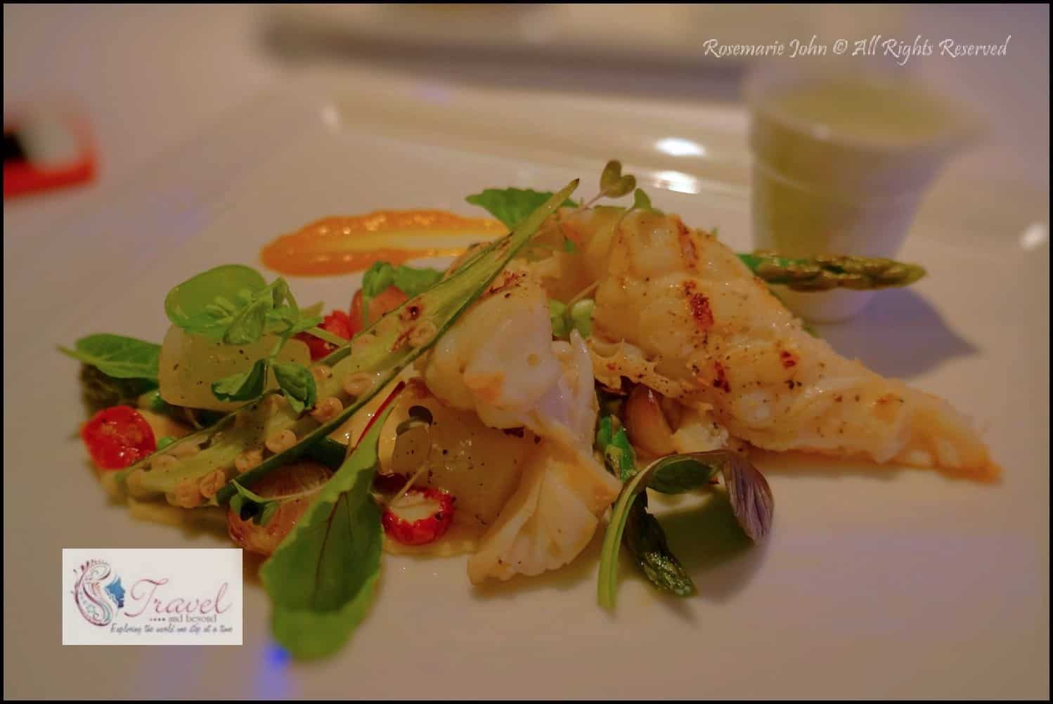 As we got comfortable at our table, Chef De cuisine, Alvrie Manangka came over to ask me how I would like my lobster cooked. After a bit of deliberation, I took his advice and waited for him to dish up my Grilled Whole Lobster and Celeriac Puree. “A French inspired dish, the lobster is made up of white radish fondant, pea sweet, green asparagus, semi dried cherry tomato, okra, micro herbs, black peppercorn powder and fish veloute”, said Manangka.
