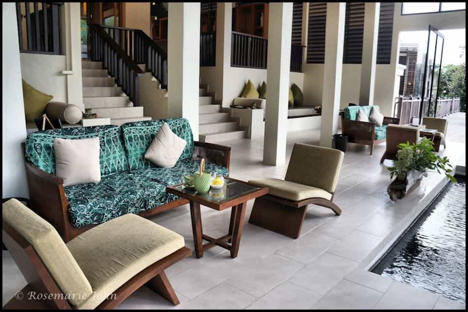 The spa lounge where you sit and have your welcome drink made from pineapple, lime, star anis, and fresh red chilli.