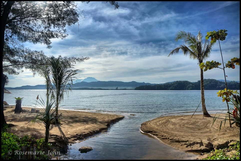 A small creek that opens up into the sea with Mt. Kinabalu in the horizon